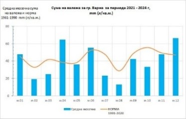 Съгласно новият, последен референтен климатичен период 1991-2020 г., средната месечна температура в по-голямата част от страната е с 1 до 3 градуса по-висока в сравнение с тази за периода 1961-1990 г., като за град Варна тази тенденция е най-ясно изразена през зимните и летните месеци. При валежа липсва ясно изразена тенденция на изменение, но като най-валежни вече се открояват месеците март, април и юни, което е в противовес с добре познатият ни до момента есенно-зимен максимум на този метеорологичен елемент. Високите температури на въздуха, все по-оскъдното количество валеж, както и липсата на трайна снежна покривка имат най-неблагоприятно влияние върху зимните посеви и реколтата.