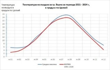 • Средната месечна температура е с 1 до 3 градуса по-висока в сравнение с тази за референтният климатичен период 1961-1990 г., като за град Варна тази тенденция е най-ясно изразена през зимните и летните месеци